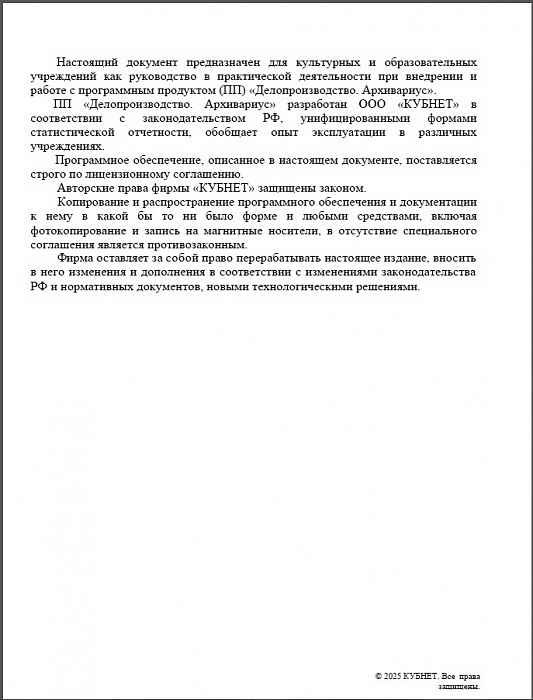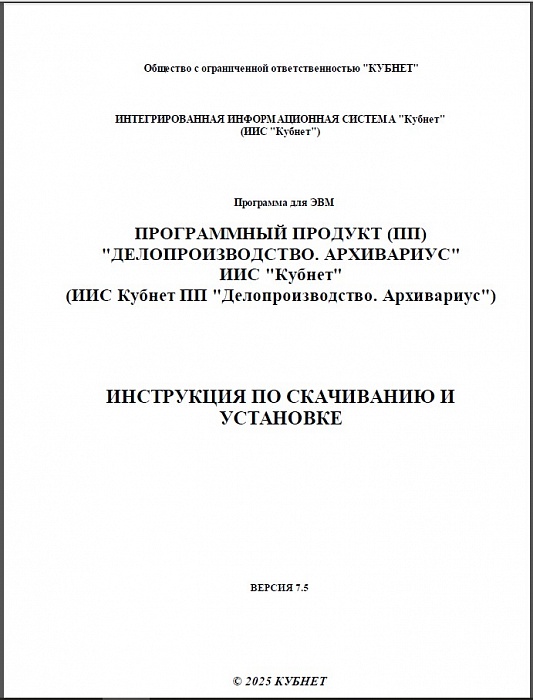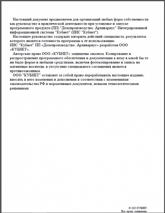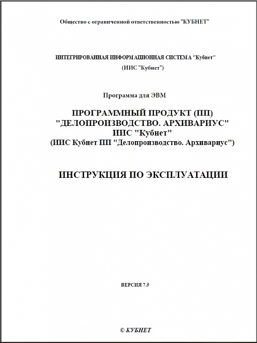 Настоящие документы содержат описание функциональных характеристик, а также информацию, необходимую для установки и эксплуатации программы для ЭВМ ИИС Кубнет ПП «Делопроизводство. Архивариус».